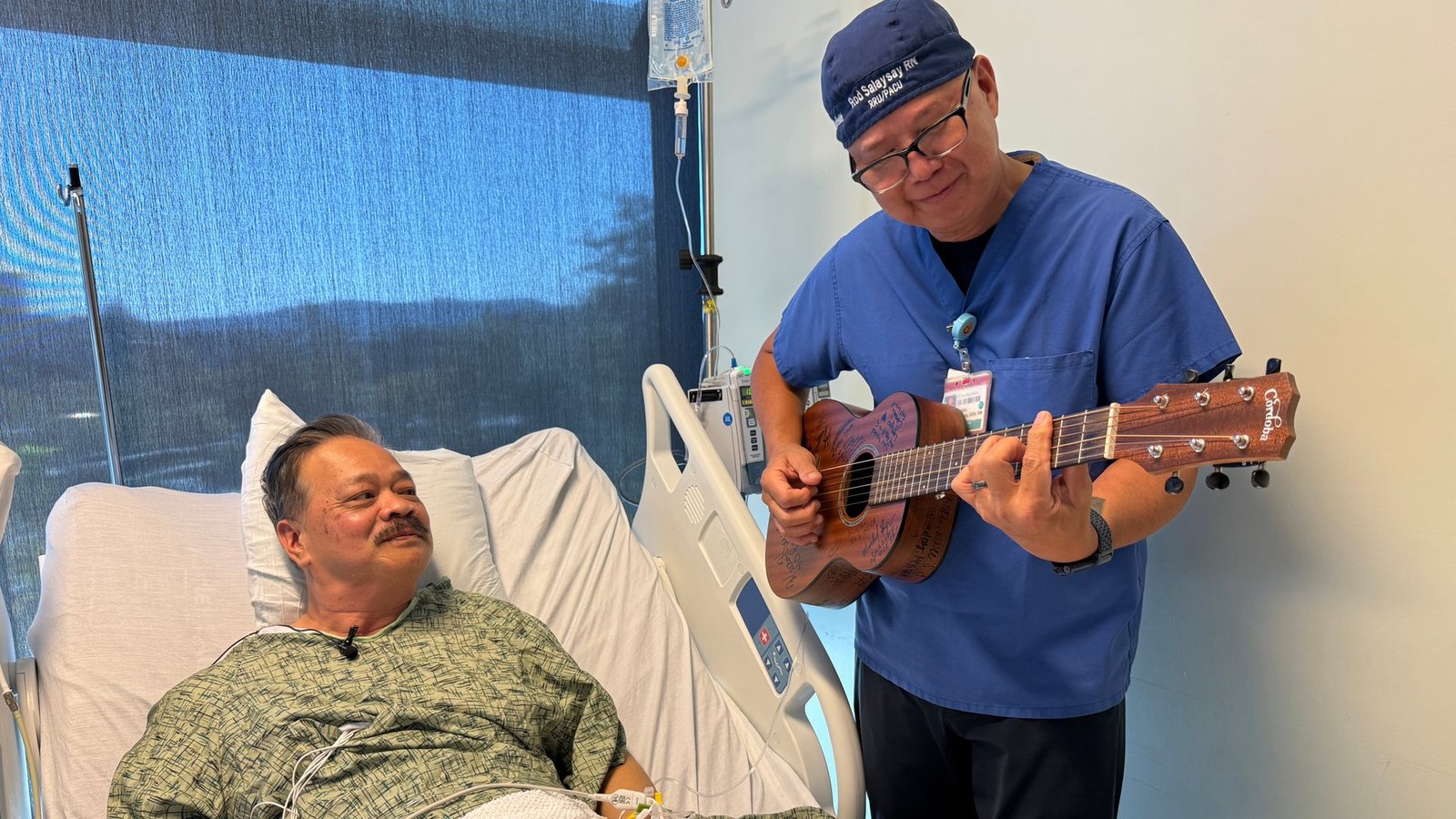 Rod Salaysay strums his guitar in a hospital room at University of California San Diego Health, offering an alternative to traditional pain relief methods. “For the last 16 years that I’ve played music, I’ve probably played for about 2,000 patients already,” said Salaysay, a nurse in the recovery unit. “That’s a lot.”